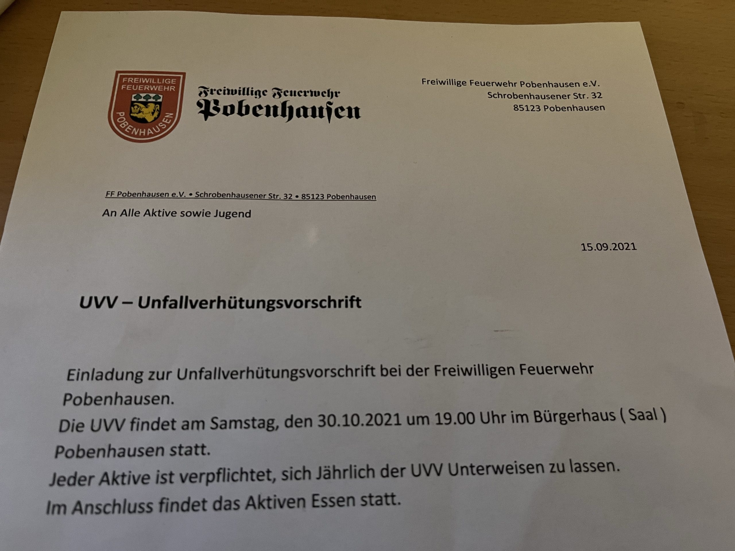 Am 30.10.2021 fand die jährliche UVV-Unfallverhütungsvorschrift der aktiven Feuerwehrmitglieder im Bürgerhaus Pobenhausen statt.
