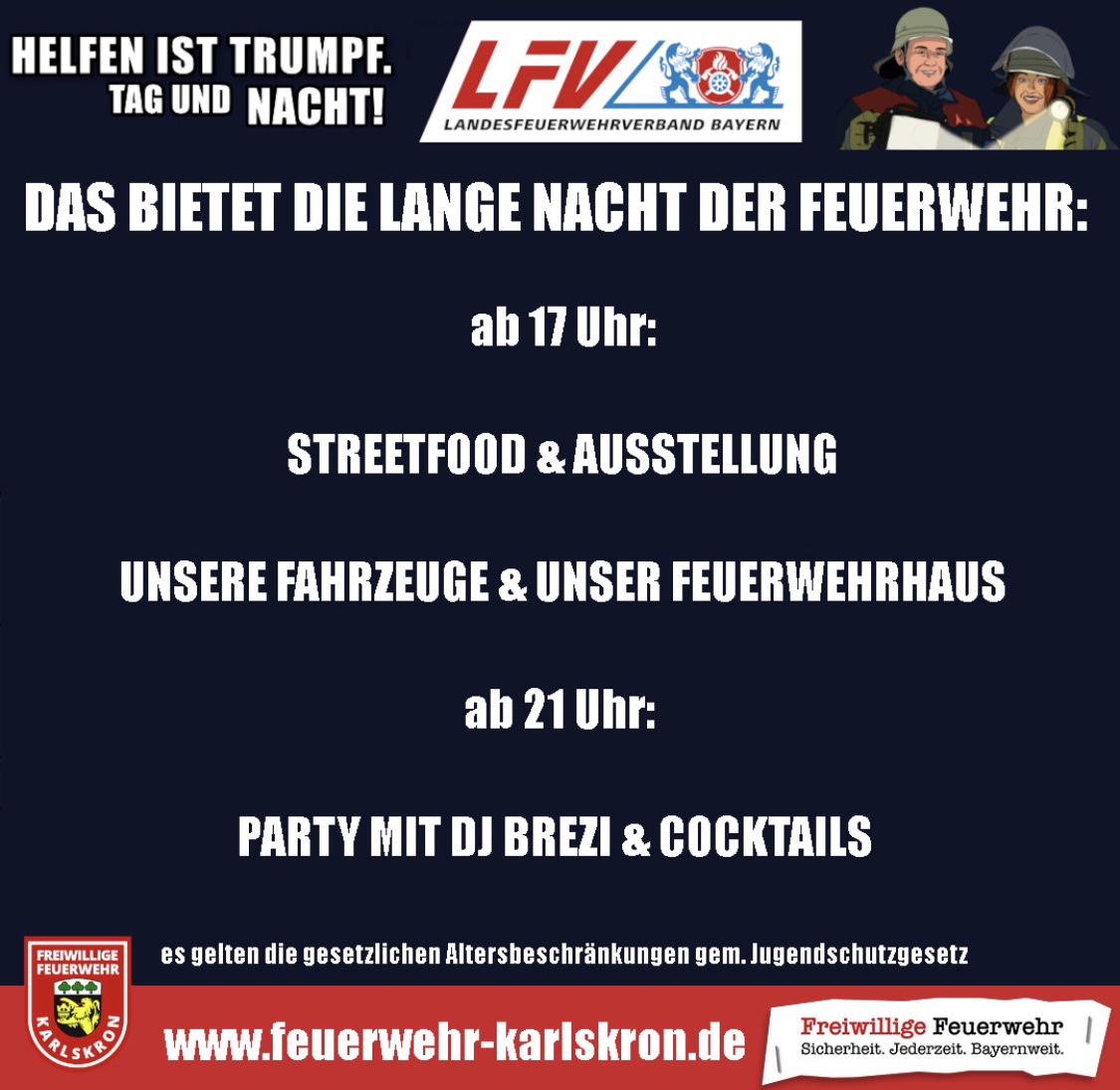 Lange Nacht der Feuerwehr in Karlskron, wir sind an einem Stand bei einer Vorführung zu finden. Besucht die Feuerwehr Karlskron und Uns an diesem Tag, wir freuen uns auf Euch.