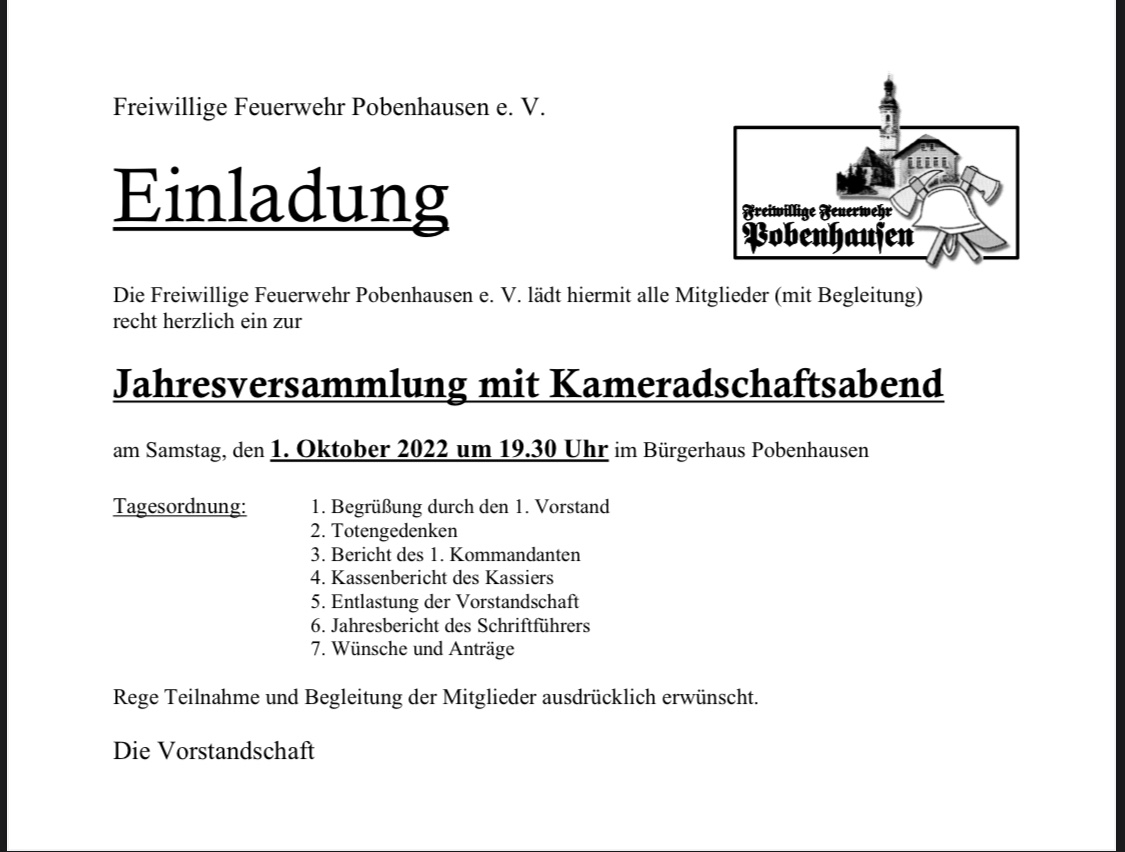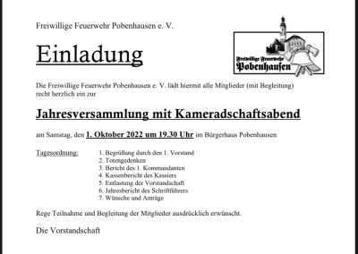 Einladung zur Jahresversammlung mit Kameradschaftsabend am 01.10.2022