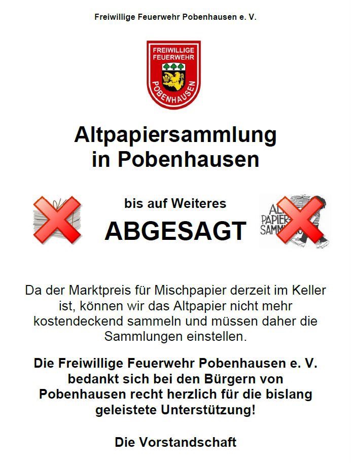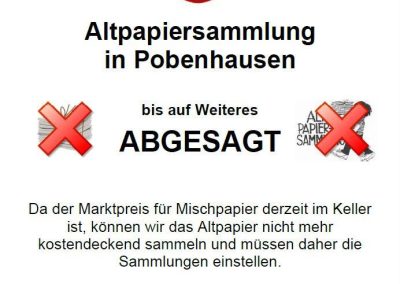 Da der Preis für unser Mischpapier im Keller ist, und unsere Kosten nicht mehr gedeckt werden, stellen wir die Sammlung ab sofort ein.