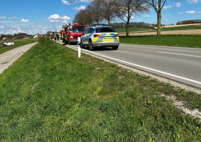 Wir wurden zu einem Verkehrsunfall mit einem Motorrad alarmiert. Vor Ort wurde ein verunfalltes, alleinbeteiligtes Motorrad mit Fahrer vorgefunden. Unsere erste Maßnahme bei diesem Einsatz war die Erstversorgung des Verletzten. Außerdem wurde der Brandschutz sichergestellt, der Verkehr halbseitig an der Einsatzstelle vorbeigeleitet sowie die Fahrbahn gereinigt. Nach einer Stunde konnte die Straße wieder freigegeben werden und wir Rückten wieder Einsatzklar ins Gerätehaus ein.