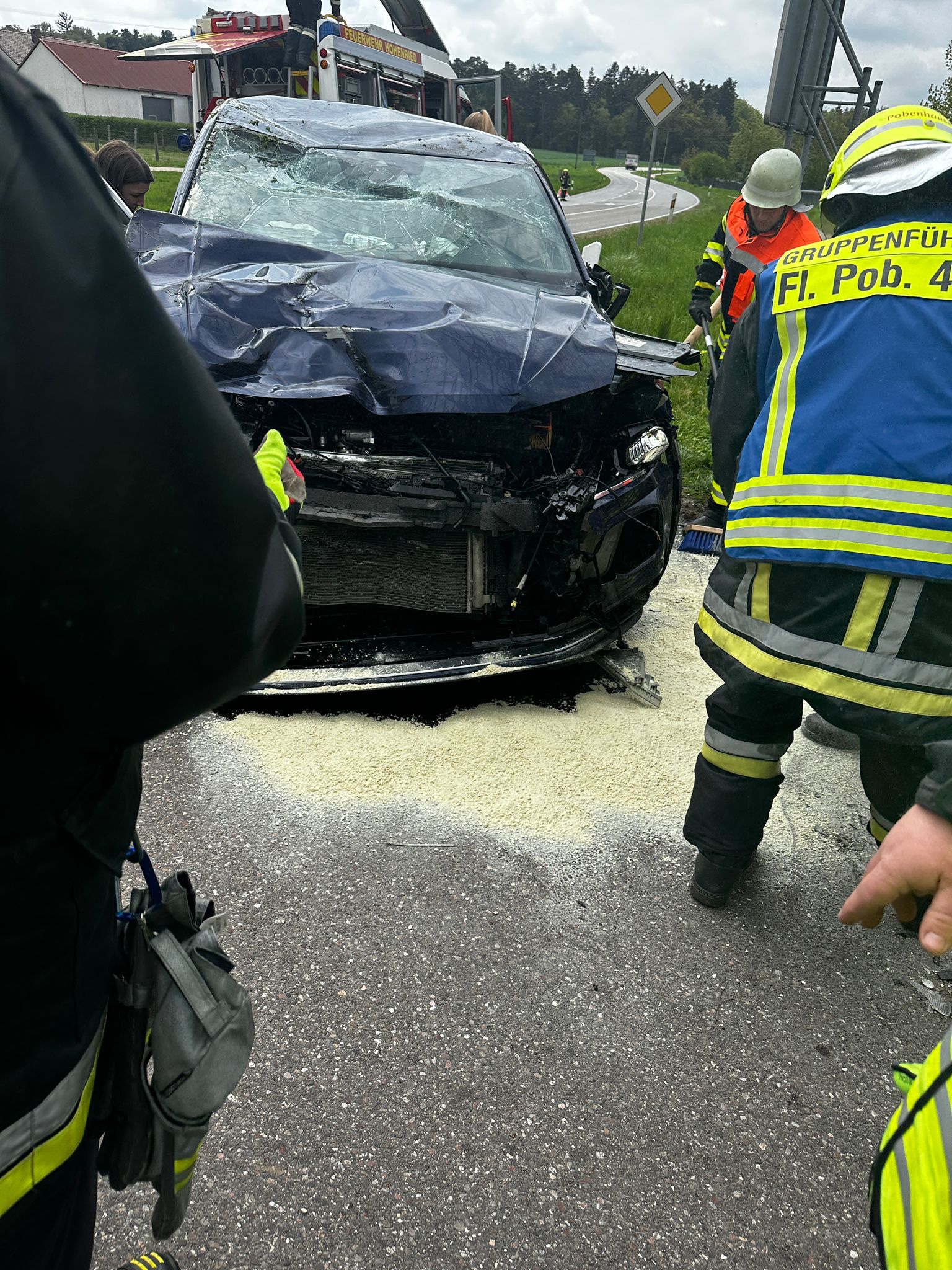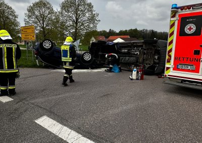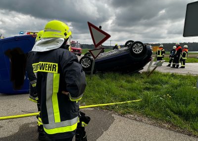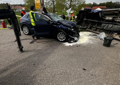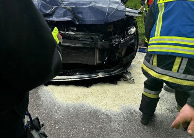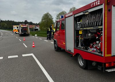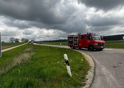 Wir wurden zu einem Verkehrsunfall mit 2 PKW´s alarmiert. Vor Ort stellten wir als Ersteintreffende Feuerwehr zwei Verunfallte PKW´s sowie zwei Verletzte Personen fest. Unsere ersten Maßnahmen waren die Betreuung und Versorgung der Verletzten. Unser MTW erstellte die Verkehrsabsicherung und leitete den Verkehr halbseitig an der Unfallstelle vorbei. Die Feuerwehr Hohenried stellte den Brandschutz sicher und band auslaufende Betriebsstoffe. Beide Personen wurden vom Rettungsdienst in ein Krankenhaus gebracht. Nach dem Abschleppen der beiden Fahrzeuge reinigten wir die Fahrbahn und übergaben die Einsatzstelle an die Polizei.