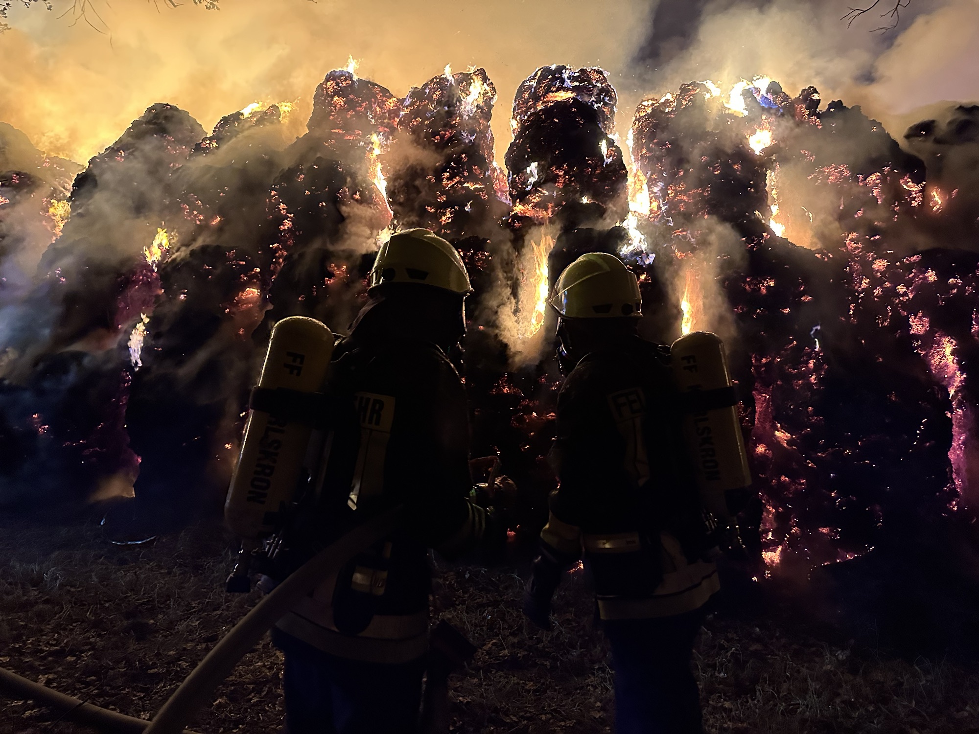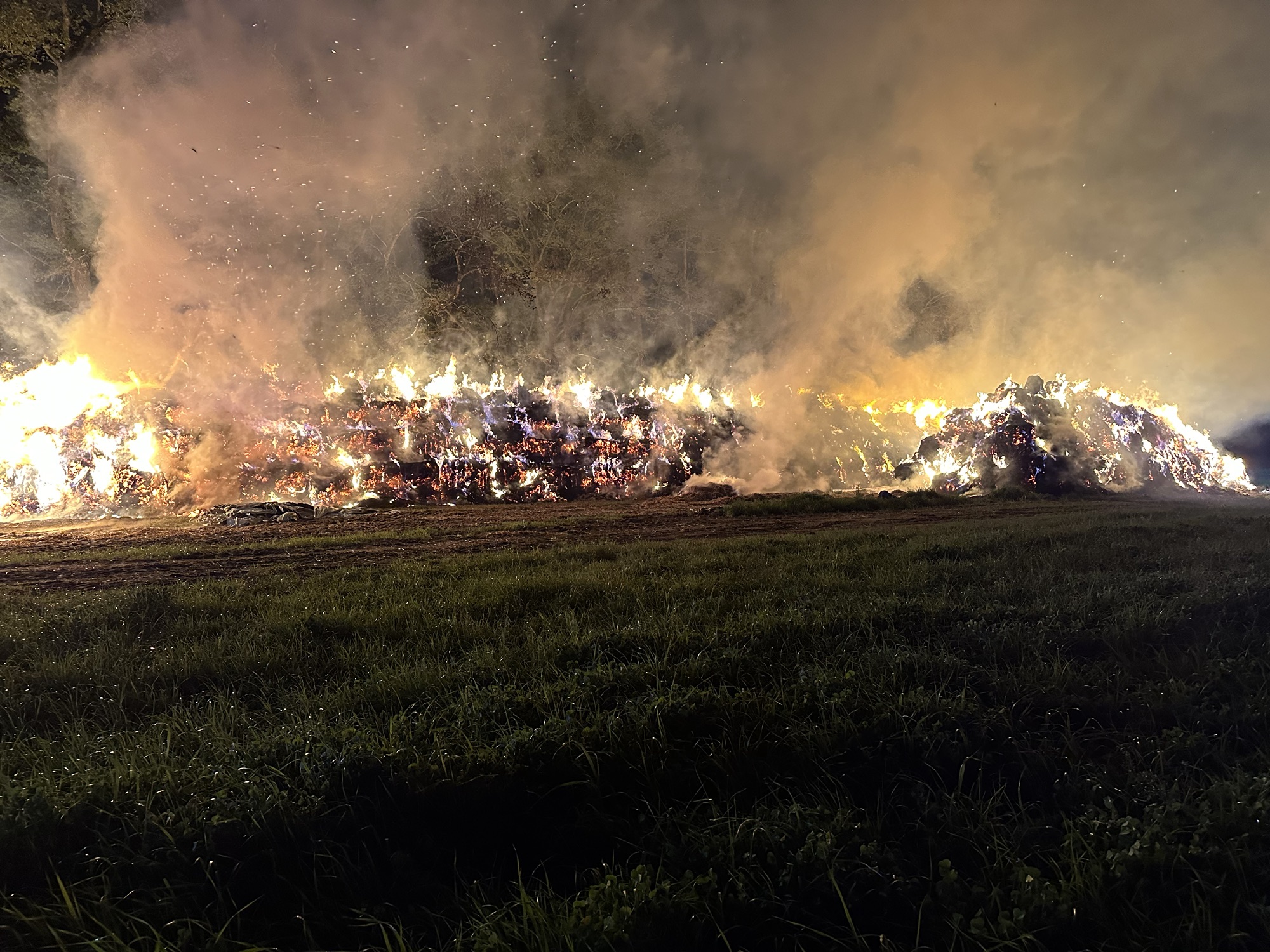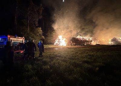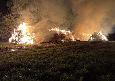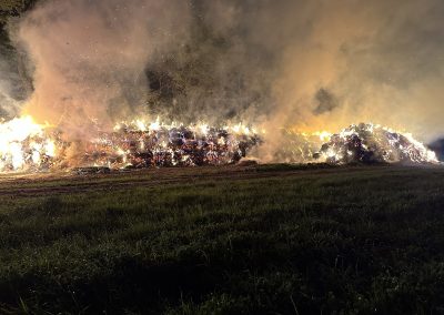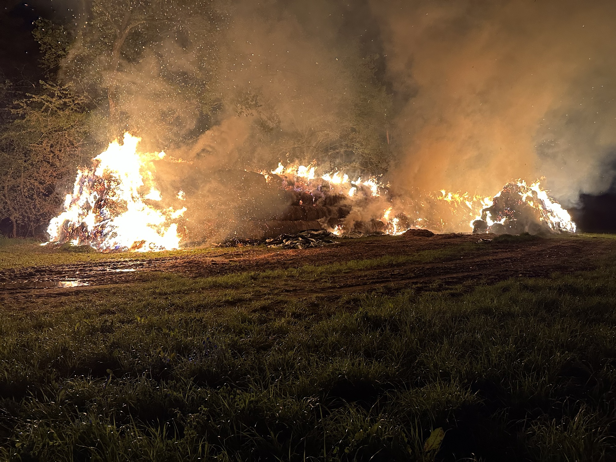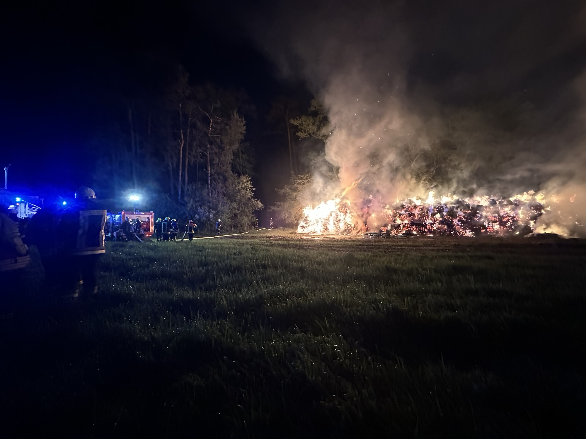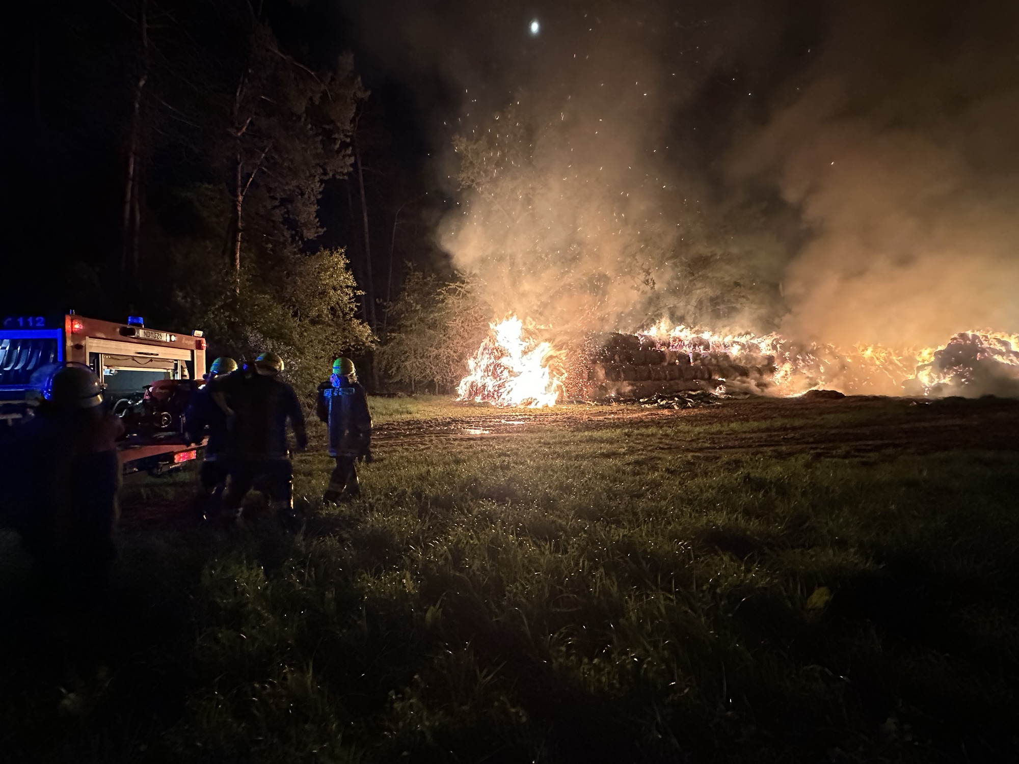 Bei unserem Eintreffen waren bereits 600 gelagerte Strohballen auf einem Feld direkt neben einem Wald in Vollbrand.