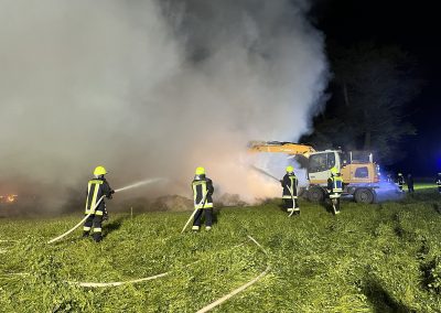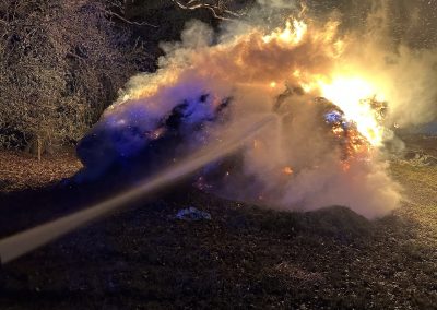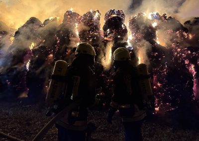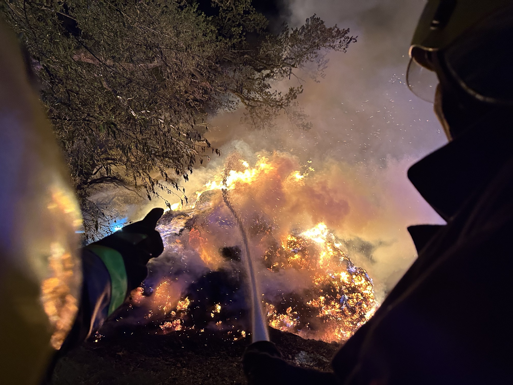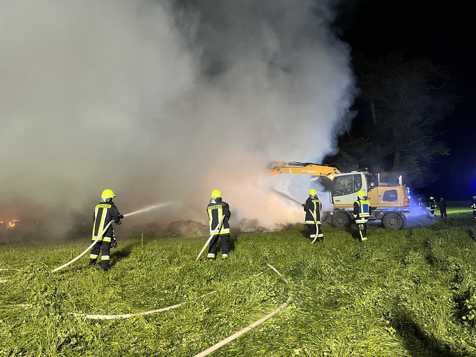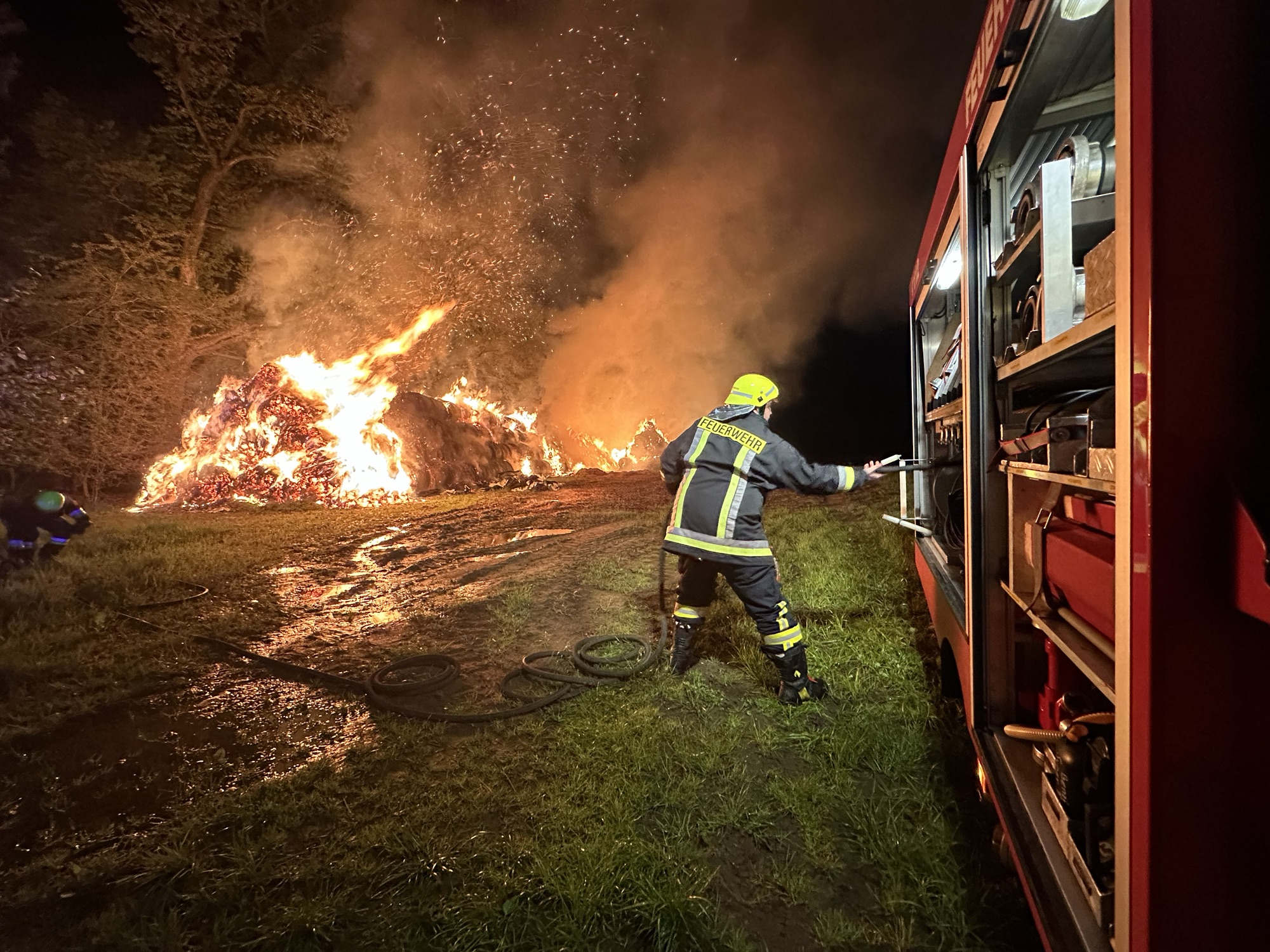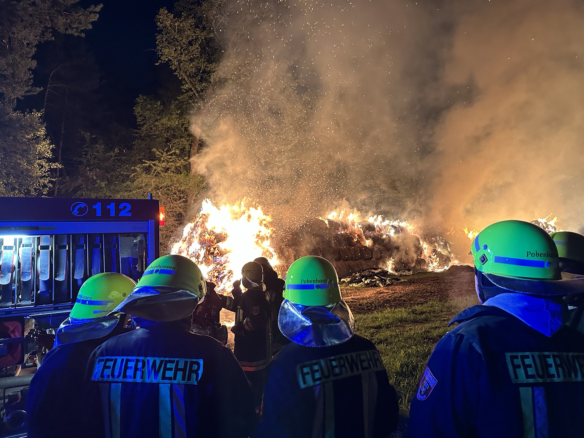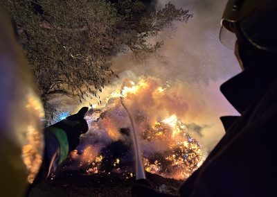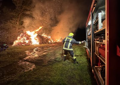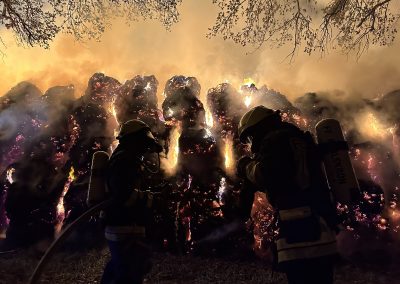 Bei unserem Eintreffen waren bereits 600 gelagerte Strohballen auf einem Feld direkt neben einem Wald in Vollbrand.