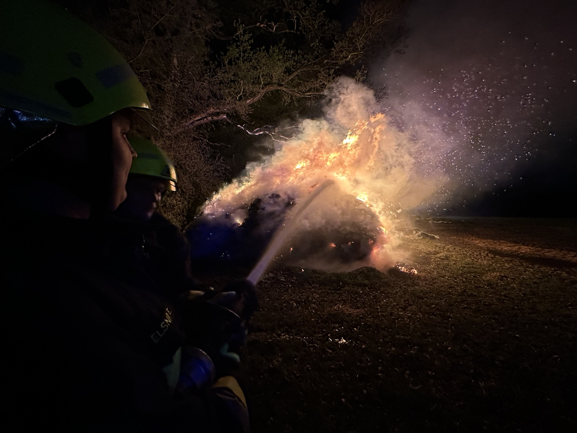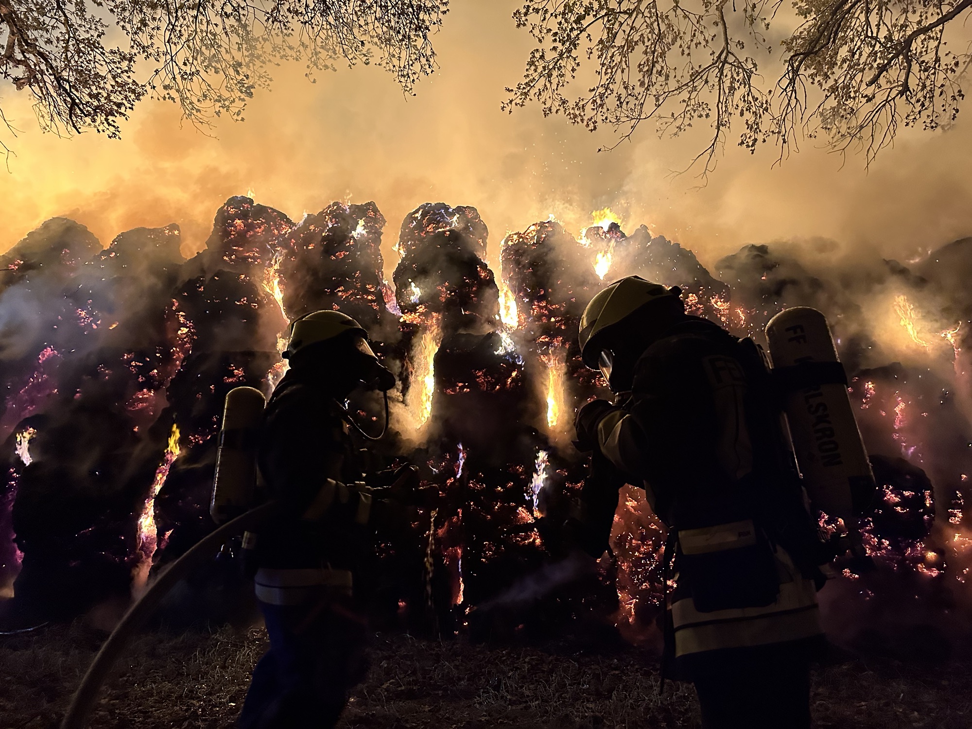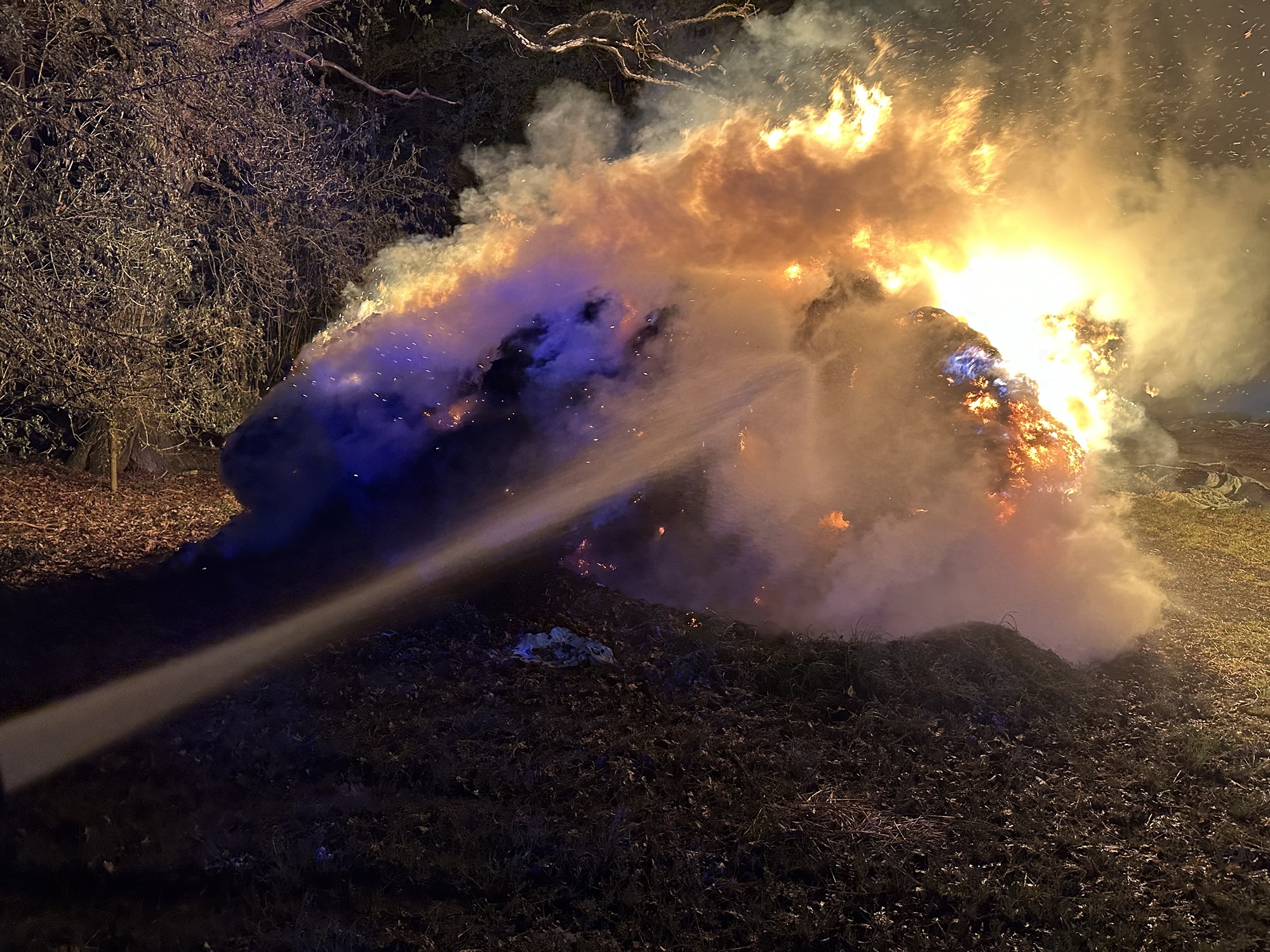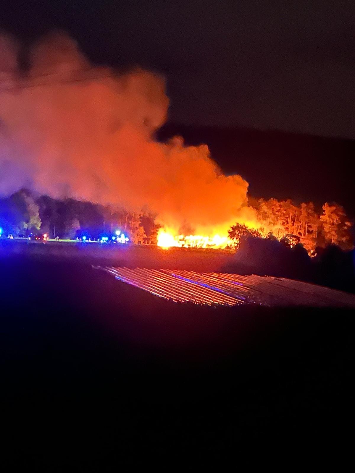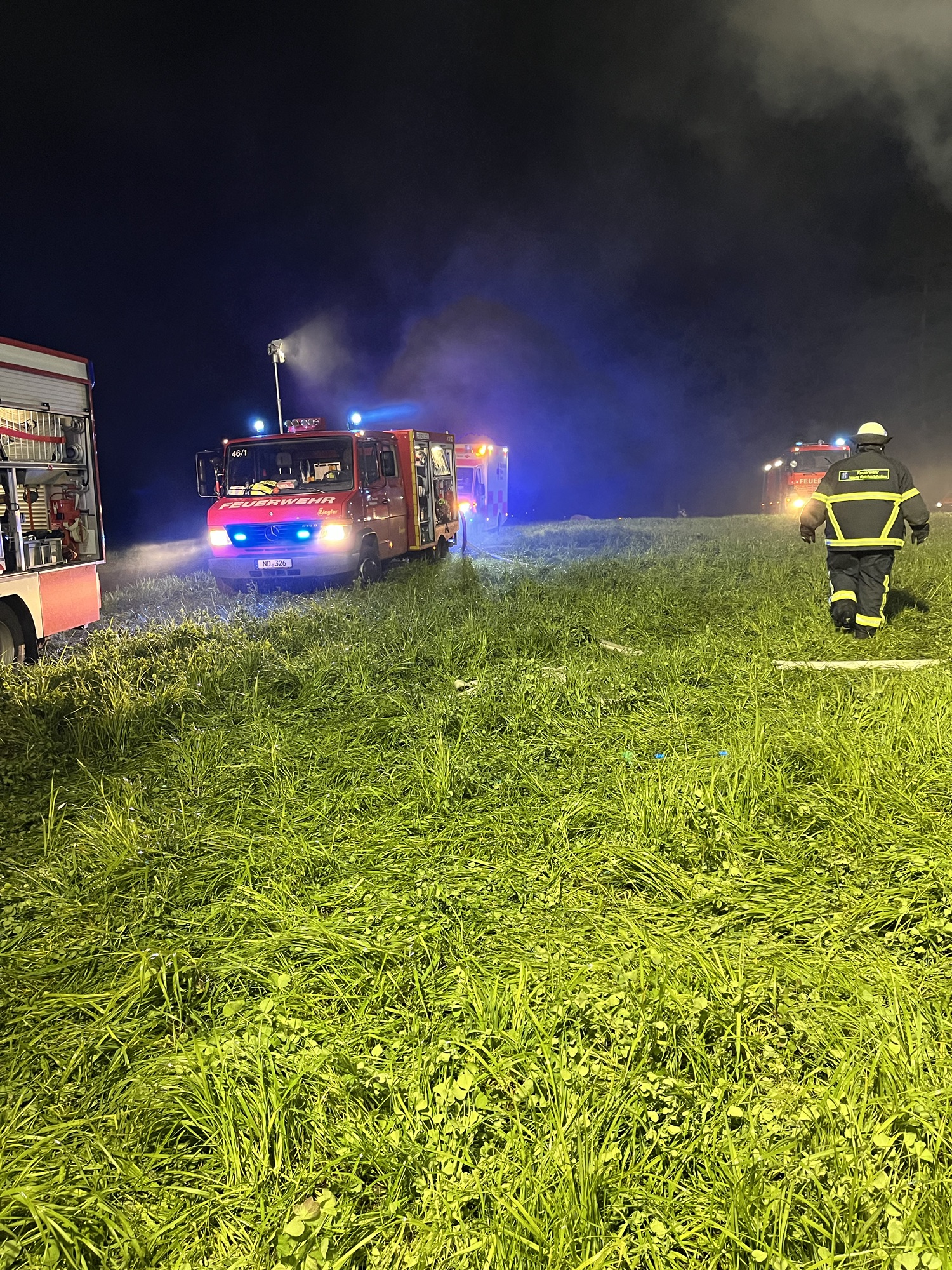 Bei unserem Eintreffen waren bereits 600 gelagerte Strohballen auf einem Feld direkt neben einem Wald in Vollbrand.