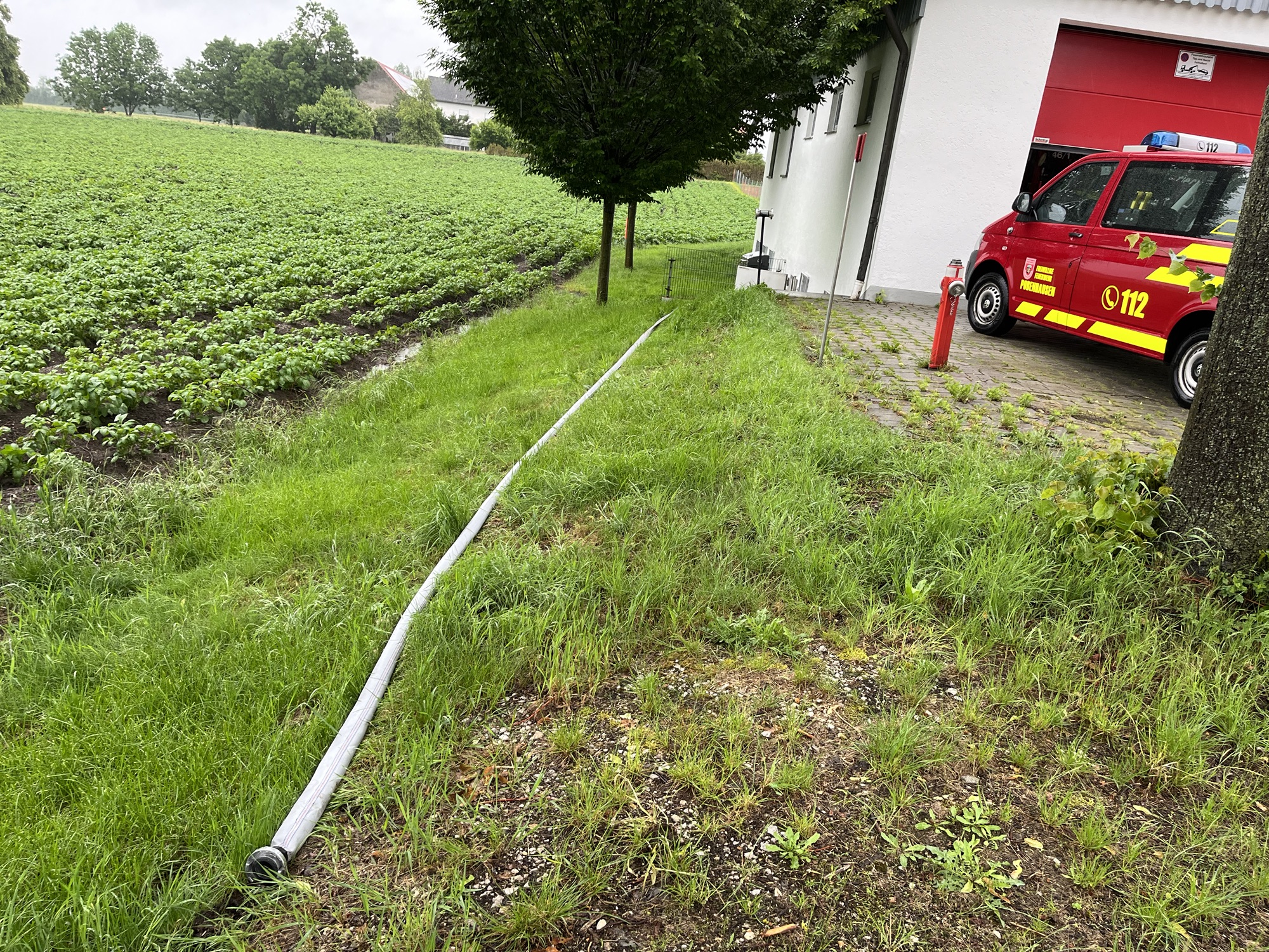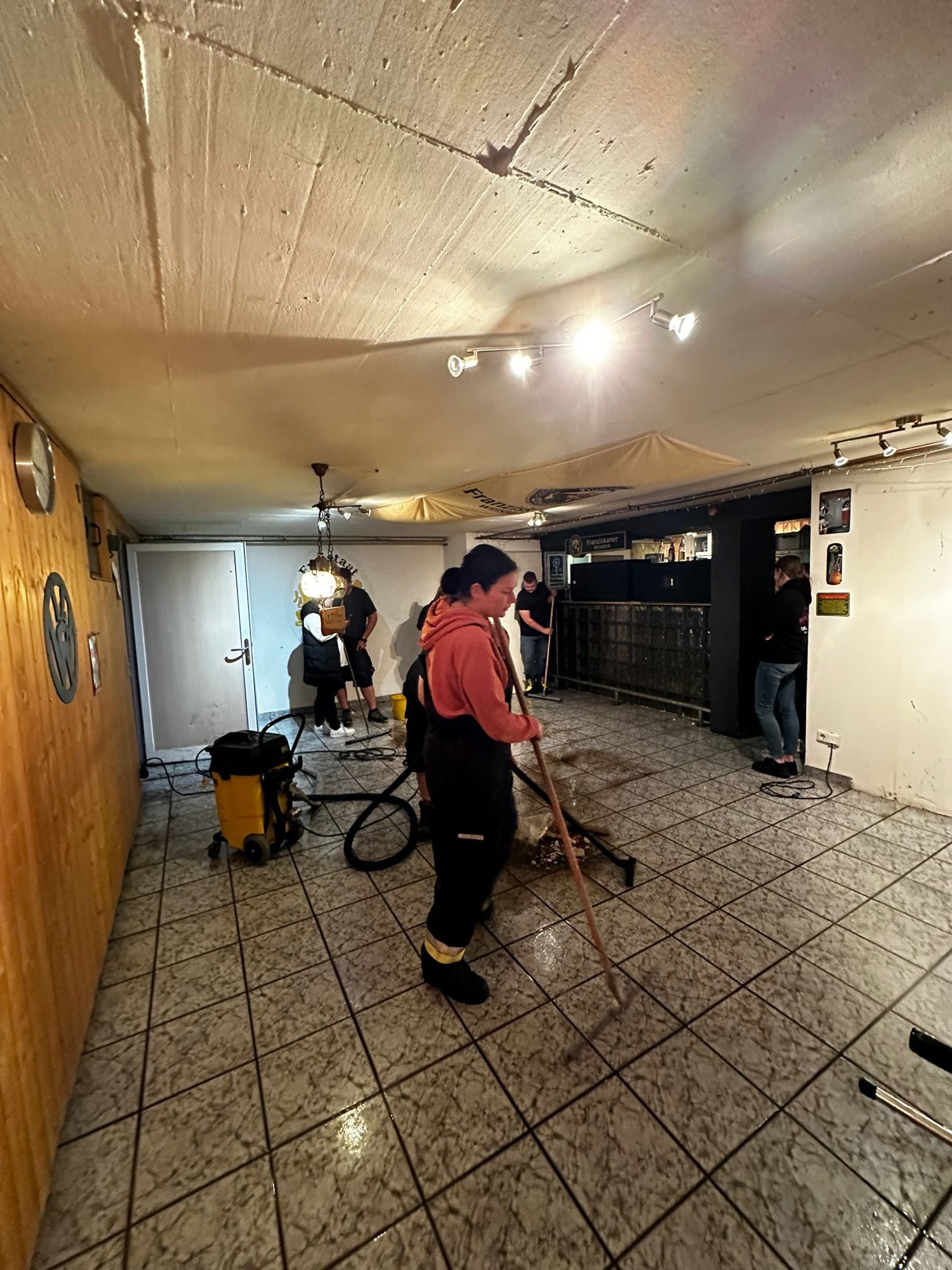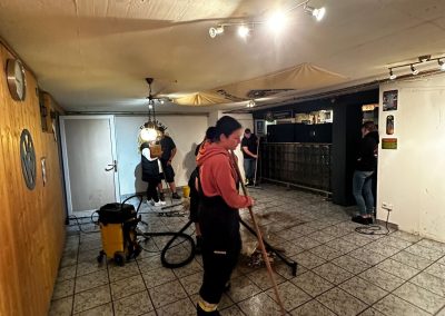 In unserem Feuerwehrhaus stand der Keller unter Wasser aufgrund des Starkregens. Wir pumpten das Wasser mit einer Tauchpumpe ab. Im Anschluss kam noch ein Wassersauger zum Einsatz.