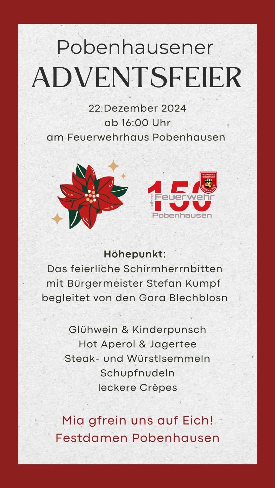 Die Freiwillige Feuerwehr Pobenhausen bzw. die Festdamen der Feuerwehr Pobenhausen laden alle recht Herzlich zu der Pobenhausener Adventsfeier ein.