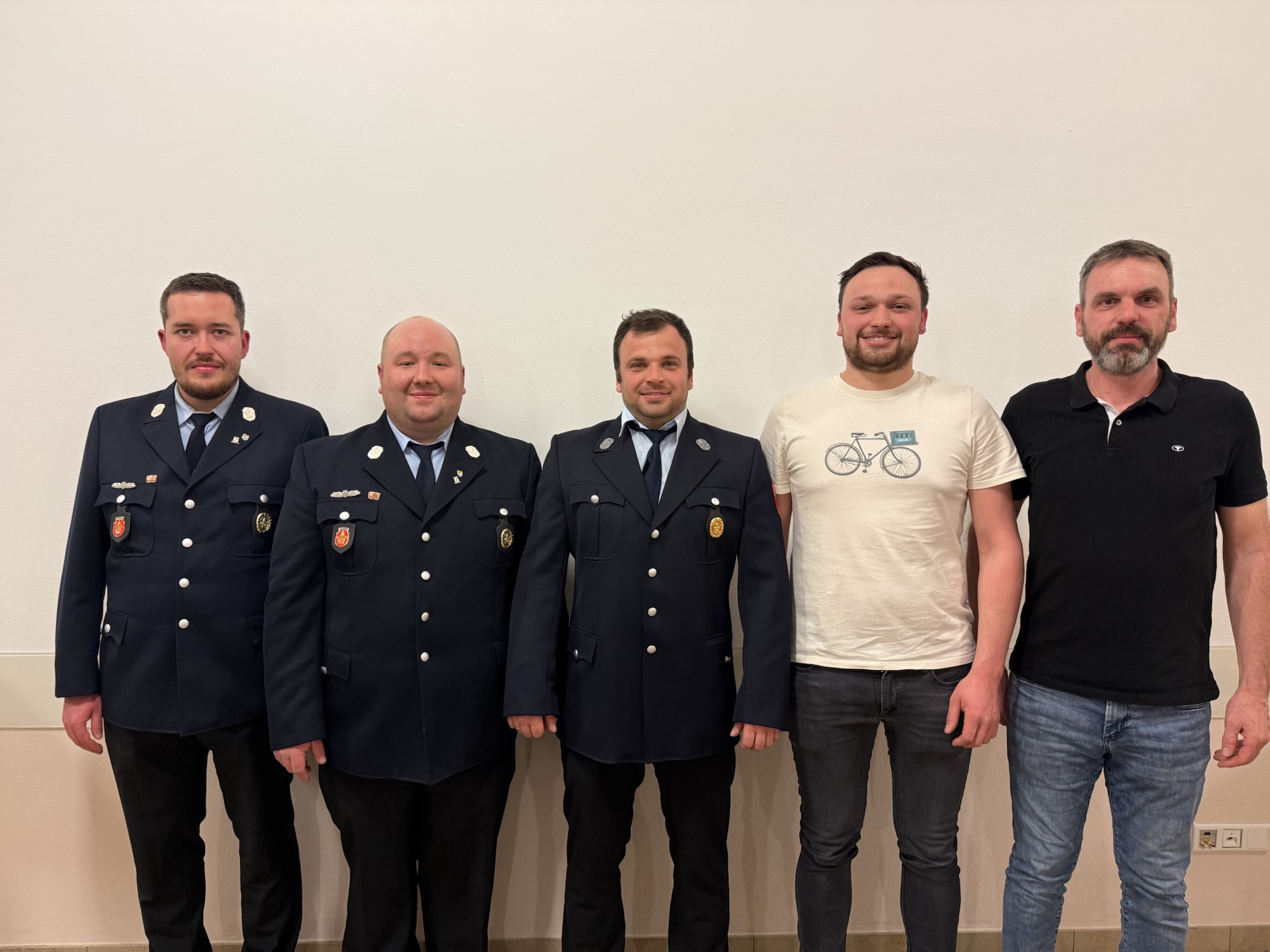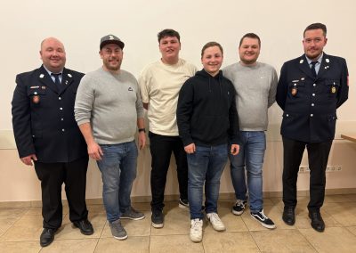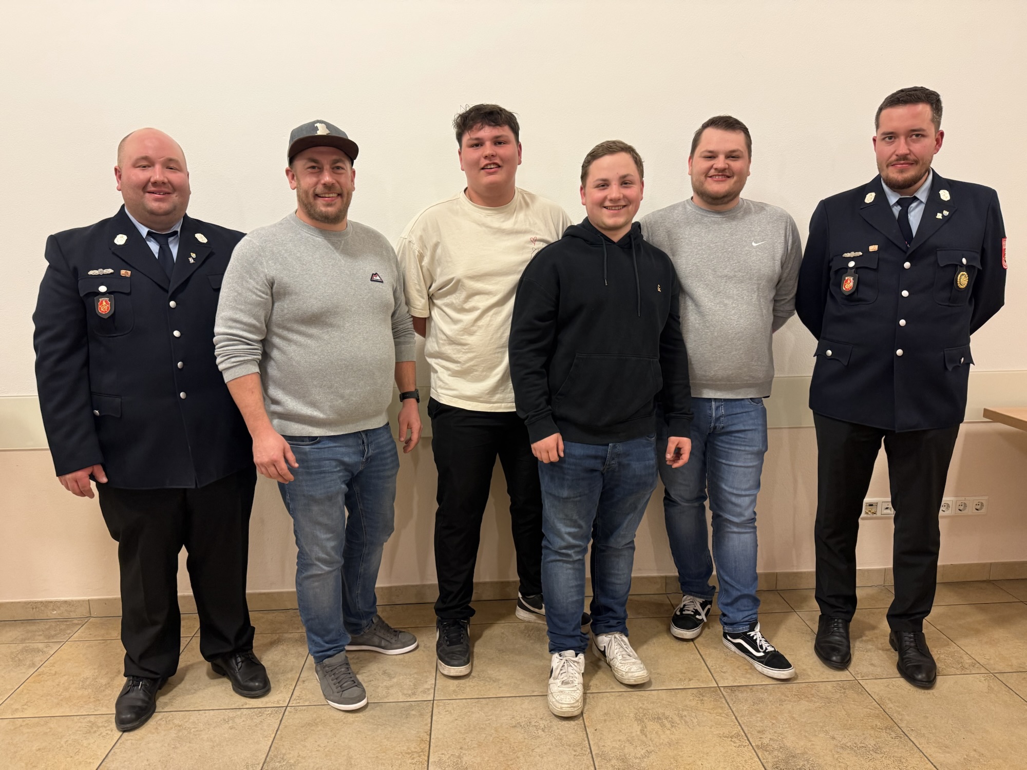 Bild 2 v.l.n.r 1.Kommandant Andreas Glöckl, Ehemaliger Jugendwart Mathias Salvamoser, Neuer Jugendbetreuer Enrico Elsner, weiterer Jugendbetreuer Elias Angermeier, Neuer Jugendwart Kevin Siebauer, 2.Kommandant Markus Spies